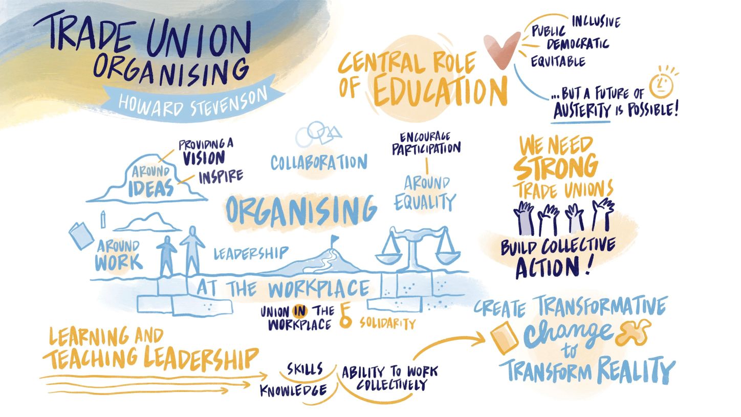 Во второй половине дня Говард Стивенсон из Амстердамского университета выступил с вдохновляющей презентацией по профсоюзному объединению трудящихся (органайзингу), которая была высоко оценена участниками.«Органайзингэтонаша главная работа»,сказал он.«Не будет никакой ведущей роли образования в восстановлении, если не будут созданы движения, опирающиеся на прочный профсоюзный органайзинг».