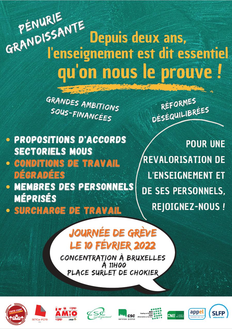 Tomorrow in Belgium, February 10 will be a strike day in education. ETUCE supports its member organisations which are part of the French-speaking trade union common front for education extended to administrative staff, workers and university staff, taking action this Thursday to denounce the lack of recognition and revaluation of their professions.
