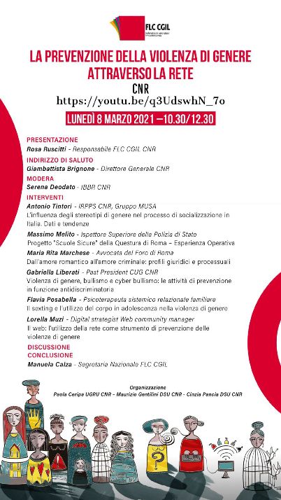 FLC CGIL, the Federation of Knowledge Workers of the CGIL, Italy, for International Women's Day has organised several national and local webinars, giving an additional venue for discussion about women in the education sectors, including schools and research. At the centre of the discussion the themes of prevention of gender-based violence, new dangers on the web, and stereotypes about women.
