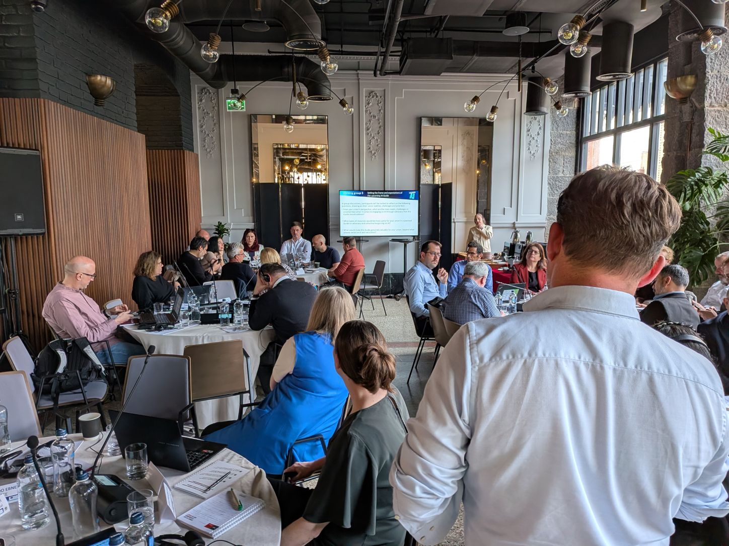 The day opened with a welcome from ETUCE and ESFTUG, followed by an introduction by Jelmer Evers and Leonardo Ebner who outlined the state of play, the aims of the workshop, and the growing urgency for coordinated union engagement on AI. Participants stressed that while AI tools are increasingly present in schools, regulation, safeguards, and social dialogue remain insufficient in many countries.
