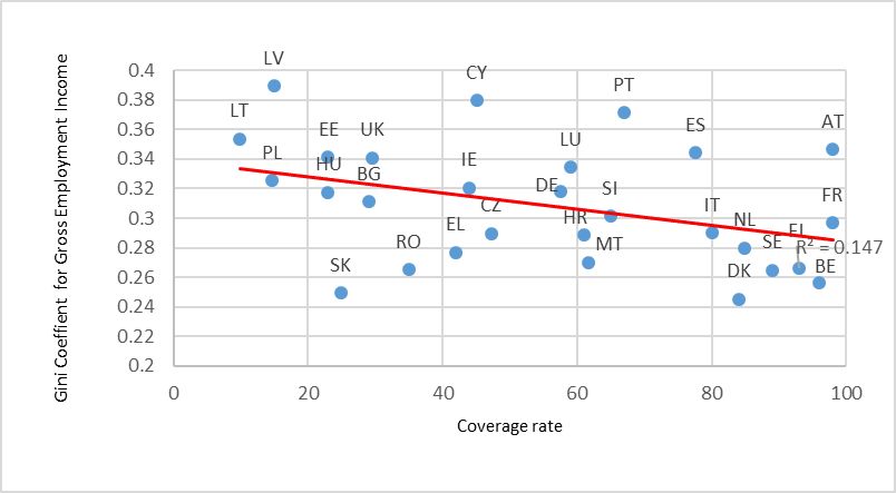 Source: Coverage rate: ICTWSS & GINI-Coefficient DG-EMPL calculations, EU-SILC UDB.