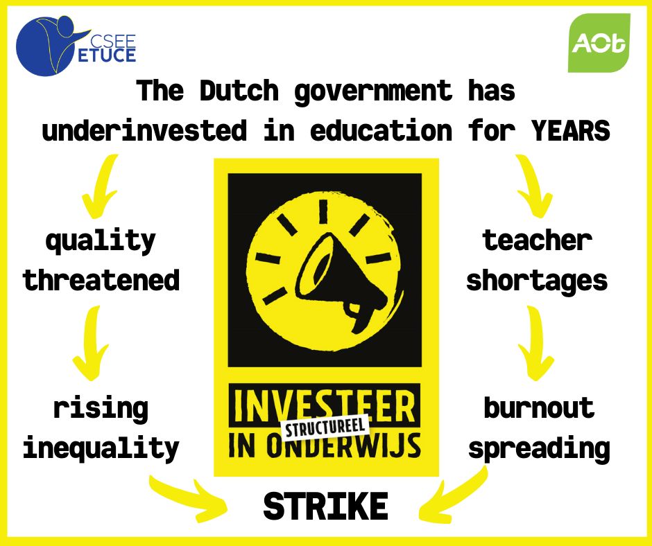 The Dutch government has ignored the warning signs for many years, but it is clear that the Netherlands’ education system in crisis. On the one hand, data show that the quality of education is falling and inequalities are rising. On the other hand, teachers and other education personnel are leaving the profession and a shortage of staff is leading to burnout among those who remain. Education trade unions have made it clear many times that these problems largely stem from the fact that education in the Netherlands is structurally underfunded.